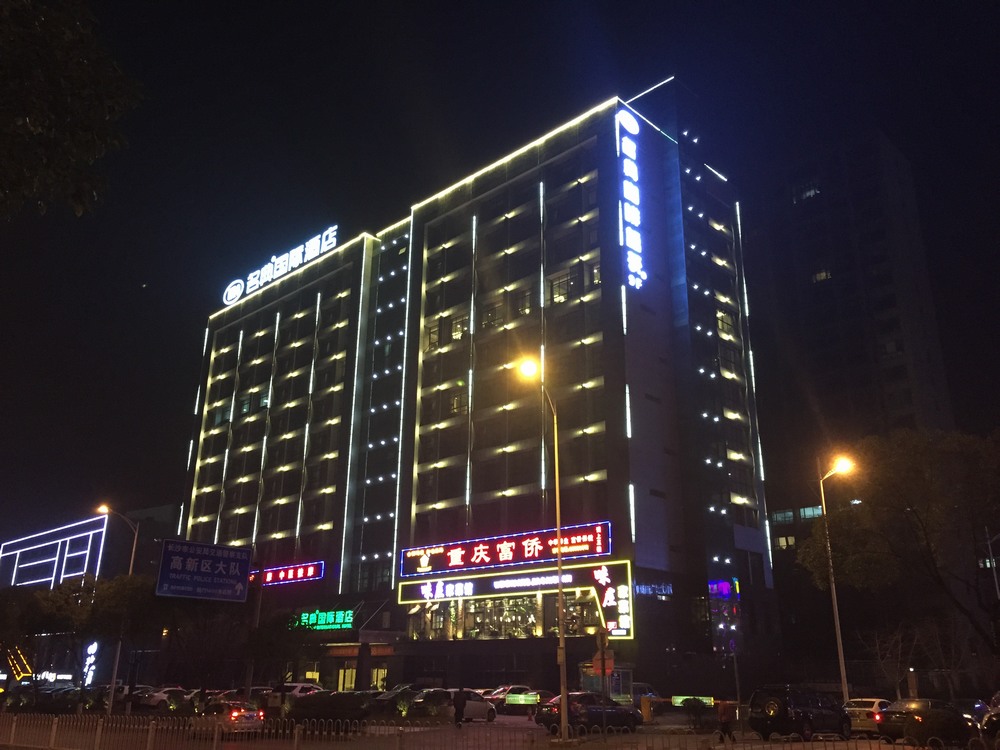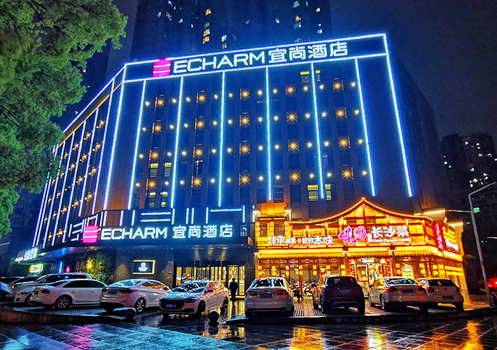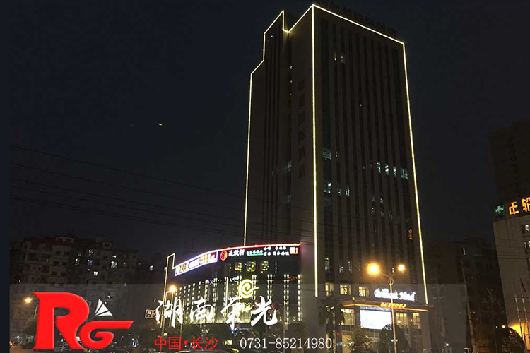 長(zhǎng)沙酒店亮化 戶外亮化設(shè)計(jì) LED夜景亮化安裝及施工工程采用IP 65防護(hù)等級(jí)的LED線條燈,十字星光燈搭配設(shè)計(jì)。燈具色溫采用冷、暖色搭配設(shè)計(jì),主線條燈勾勒出建筑亮化的輪廓,采用暖色星光燈營(yíng)造長(zhǎng)沙酒店亮化的溫馨氛圍。